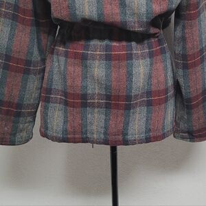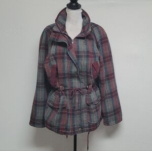 Out Brook Vintage 90s Maroon Gray Plaid Wool Blend Tie-Waist Anorak Jacket.