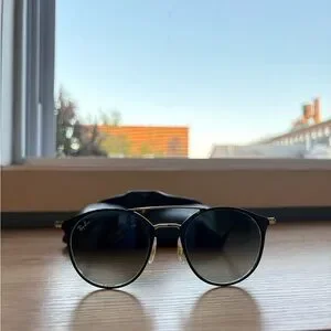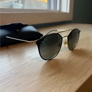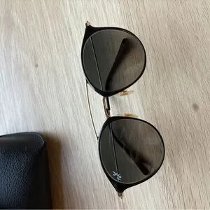 Stylish Ray-Ban sunglasses with a black frame and gold accents. Perfect for a modern look.