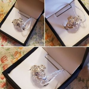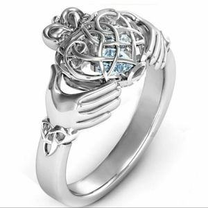 New, unworn, in the original box with "do not remove" tag still attached. Amazing detail, sterling silver Claddagh/ Celtic intricate scrolled caged heart ring. Floating heart shaped genuine aquamarine & white topaz stones are inside the heart. Back side has a cute key shape cut out. Size 7 Marked 925, Displaying symbols of love, friendship, & loyalty, in addition to the trinity knot.