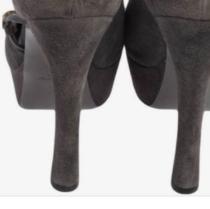 A classic to add to ones shoe collection is this pair Crafted by Yves Saint Laurent using suede in a grey shade, the pumps are detailed with side buckles, tall heels, and sturdy platforms for maximum support.