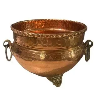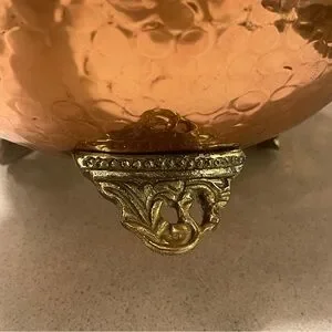 Add timeless warmth and vintage charm to your space with this hammered copper planter featuring ornate brass handles and claw-style feet. The hand-hammered texture and rich copper tone create a classic old-world look, while the brass detailing adds elegant contrast. Perfect for use as a planter, centerpiece, or decorative cauldron, this piece makes a striking accent in any farmhouse, Tuscan, or traditional décor.