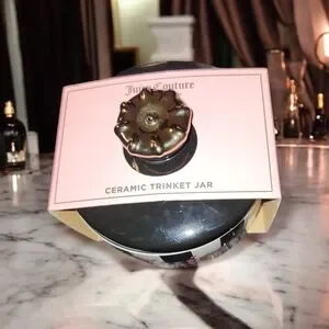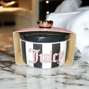Stylish black and white striped trinket jar container with 'Juicy' in pink lettering. Perfect for storage or decor. These are rare and hard tofar. Perfect for vanities or bathroom decor.
