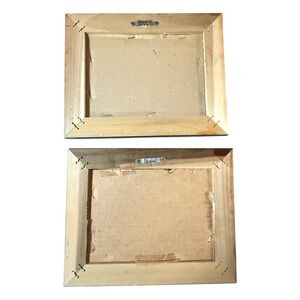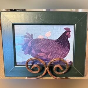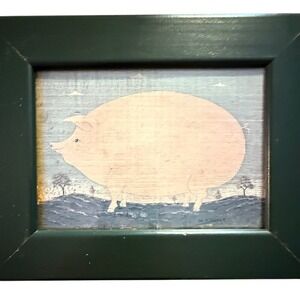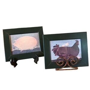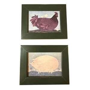 Set of Vintage Folk Art Prints Dark Green Wood Framed Pink Pig and Red Momma Chicken Hen with Chicks. Good Vintage Condition. Some scratches on wood. Pictures only. Display racks not included. Color may vary due to lighting. Please see pictures as they are part of the description and approximate measurements. Ships from a smoke free home.
