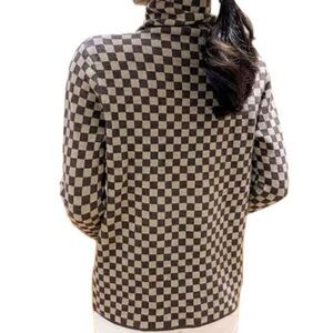 Gabby Isabella Women's Long Sleeve Funnel Neck High Collar Pullover Sweater with Juliet style sleeves with button accents and check pattern