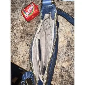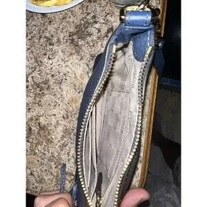 The bag has a zip closure and a gold hardware color that adds a touch of elegance. The handle/strap is made of blue leather and metal, and the lining is made of beige leather. The bag is perfect for any occasion, whether it's for work, travel, or a night out. It comes with a brand card and is part of the Michael Kors Jet Set product line.