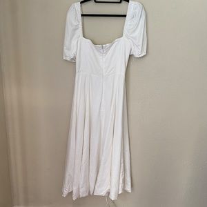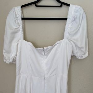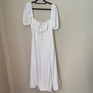 Elegant white midi dress. Features puff sleeves and front slit. Perfect for any occasion. I wore it for a beach photoshoot and it was perfect. The sleeves fit me too large but looked so cute off the shoulder as well!!