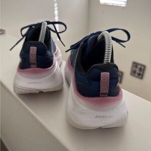 Navy athletic shoes with pink accents. Designed for performance and comfort. Ideal for running and workouts.