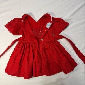 Charming red smocked dress featuring a white collar and intricate embroidery. Perfect for special occasions.