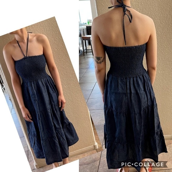Dark Denim Sundress. Top half is strapless w/elastic, bottom is ruffle like. Stops @/below knees. Perfect for 🌞. 80% Cotton 20% Poly