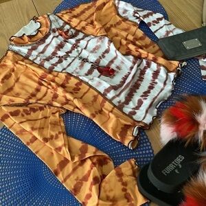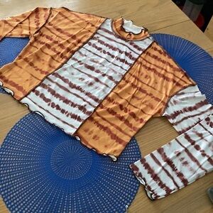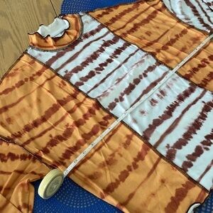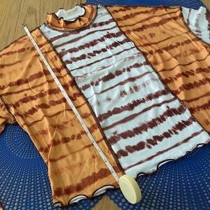 Multicolor, casual, tie-dye with lettuce trim on the bottom and sleeves medium stretch. Fabric is 95% polyester 5% elastin. Machine wash or dry clean. It is not sheer.