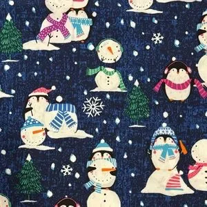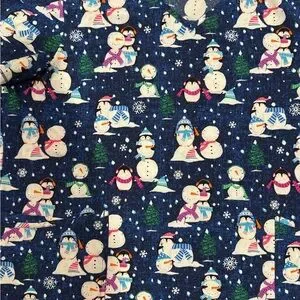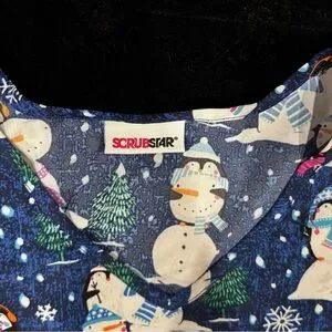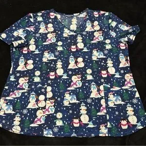 Festive snowman and penguin design on a navy blue background. Ideal for holiday winter work wear. Medical/Veterinary Medicine. 2X. True to size and very comfortable. Lightweight and stretchy. Does not shrink. Gently used and in great shape.