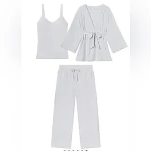 This three-piece set includes a wrap top with room for a bump, camisole with adjustable clip-down straps, and wide leg pants with a drawstring and pockets.