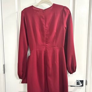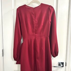 Lulu’s wine red skater dress with front tie wrap and long sleeves mid thigh length