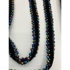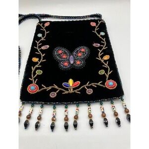 This black velvet/silk crossbody bag features intricate bead work. This eye-catching purse showcases a vibrant butterfly design surrounded by floral vines, all meticulously crafted with colorful beads. The bag is finished with a beaded strap and playful beaded fringe along the bottom. The interior is lined with a black silk and has a zipper closure. A stylish and unique accessory that adds a touch of bohemian flair to any outfit. Perfect for a night out, a special event, or adding a pop of color to your everyday look.