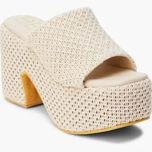 Chunky, platform sandal with woven finish adds abundant texture to an arch-supporting sandal set on a retro-chic platform sole.
