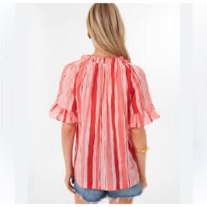 striped, pink, coral, ruffle, tassel, boho, resort, spring, summer, beach, vacation, lightweight, flowy, feminine, casual, XS, blouse, top, airy, flirty, chic, coastal, girly, preppy