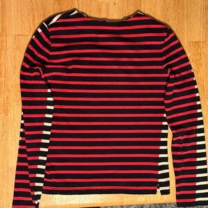 Chic and versatile striped long sleeve top. Perfect for casual outings or layering. Features a classic black and cream stripe pattern blended in with red and black stripes on the back.