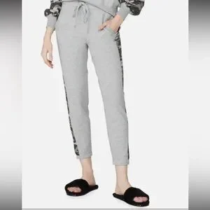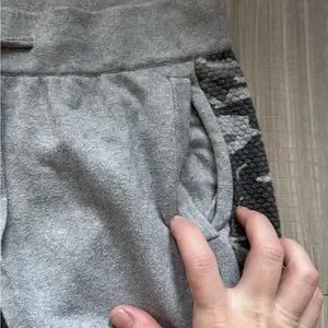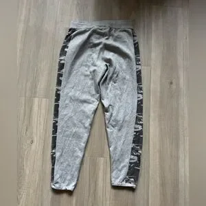 Light gray joggers featuring camo side panels. Soft fabric with adjustable drawstring waist. Ideal for casual wear.