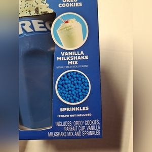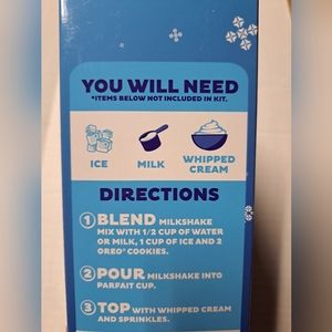 Kit includes 2 Oreo cookies, vanilla milkshake mix, Oreo ceramic cup, and sprinkles. Blend the milkshake mix with 1/2 cup of water or milk, 1 cup of ice, and 2 Oreo cookies. Pour milkshake into the parfait cup and decorate with sprinkles and whipped cream!