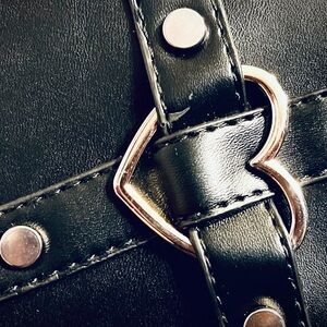 Stylish black heart-shaped crossbody bag, with a rock and roll strap and buckle flare, featuring silver hardware, and adjustable shoulder strap