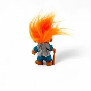 Features: Troll doll with bright orange hair, uniform, bat, and ball