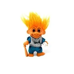 tep up to the plate with this vintage Russ Berrie Baseball Troll Doll dressed in full Florida Marlins gear! With its wild orange hair, team uniform, and accessories including a tiny bat and baseball, this troll doll is a fun piece of 1990s sports memorabilia.