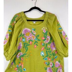 Sundance Womens Top Green Embroidered Floral Ramie 3/4 Sleeve Blouse Boho Large