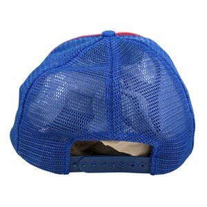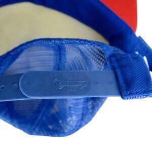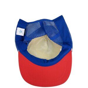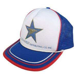 Bold Americana meets vintage utility in this 1970s–80s snapback trucker hat by U.S. Crown Co. Featuring Southwest Distributing’s eagle-in-star logo, this red, white, and blue cap sports a rope-accented brim, breathable mesh back, and adjustable snap closure. Light wear and a faint front discoloration consistent with age. A rare regional advertising piece with patriotic flair—perfect for collectors, stylists, or fans of retro headwear.