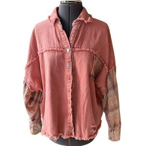 POL Pink Distressed Denim Plaid Patchwork Shirt Jacket Women's M