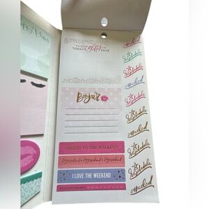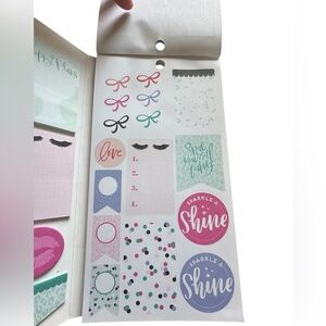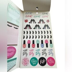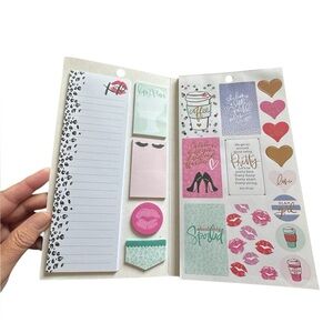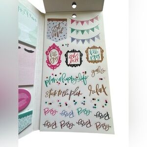 The Happy Planner brand Glam Girl Accessory Book. Comes in a folio folder. Elastic strip closure. Includes sticky notes, notepad and many stickers. Flaw-is missing 1 girl sticker-is shown in photo. Add fun and function to your planner or craft projects!