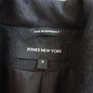 Jones New York, wool coat, winter coat, midi coat, dark gray coat, wool blend, button front, classic style, women’s outerwear, size 8, elegant coat, warm coat, fall fashion, winter fashion, vintage inspired, timeless style, layering piece, preowned coat, dress coat, long coat