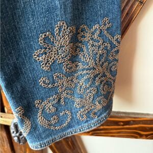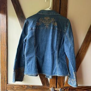Stylish blue denim jacket with intricate sleeve detailing. Perfect for casual outings.
