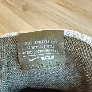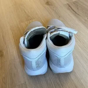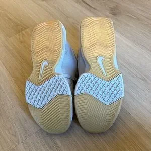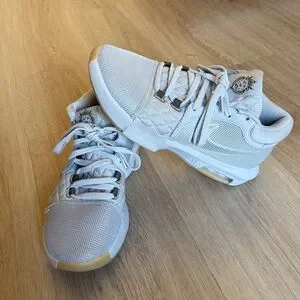 Stylish Nike men’s basketball shoes in light gray. Size 9. These shoes were worn exclusively on the basketball court for one season, never outside. They are comfortable and durable.