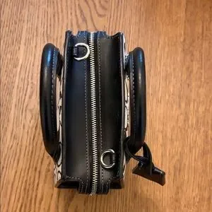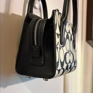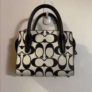 Cute as a bug mini carryall in Coach Signature leather. Black and white motif with very soft tan interior lining, black handles and crossbody strap and bright chrome hardware. Converts to a crossbody bag easily with the strap (included). This pre-loved bag is in showroom condition. You will absolutely love this little charmer!