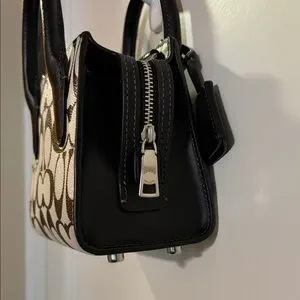 Stylish Coach mini satchel with signature monogram. Features black handles and accents. Ideal for everyday use.
