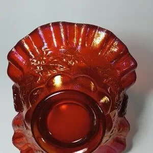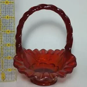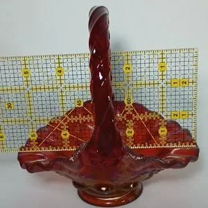Fenton purchased the mold for this basket from the Westmorland Glass Co. when it went out of business. Pattern called "Paneled Grape". Ruby Amberina is a deep red with a crackled purple and gold carnival glass finish
