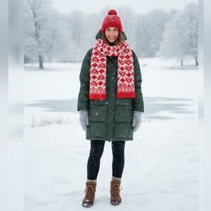 Stylish red and white scarf. Perfect for any season. Adds a pop of color. Measurements 15x92 material 14% wool 33% nylon 53% acrylic. Imported