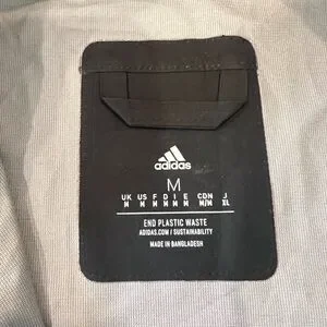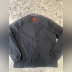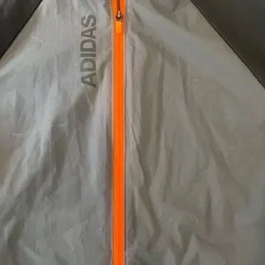 Sleek Adidas windbreaker with a modern gray and black design. Features vibrant orange accents for a bold look. Lightweight and perfect for outdoor activities. Lightly used - just a few white marks on the front of it as pictured. No rips or tears. Tons of life left!