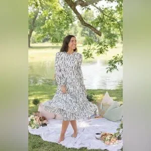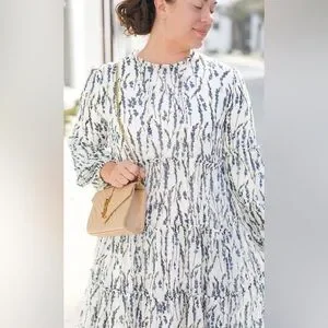 Chic long sleeve dress with a blue and white pattern. Perfect for elegant occasions.