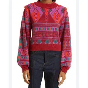 Farm Rio Crewneck Balloon Sleeve Sweater in Red Size L