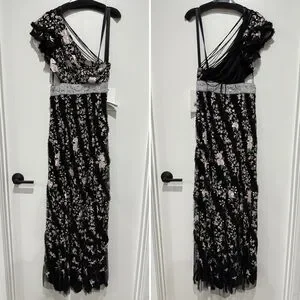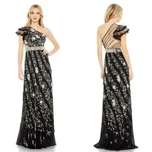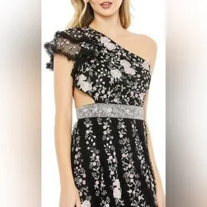Mac Duggal Floral Embroidered One Shoulder Formal Open Back Gown in size 4. New with tags. No flaws. Open lace-up back full floral embroidered one shoulder long maxi formal dress with cut out side and ruffle details.