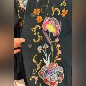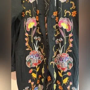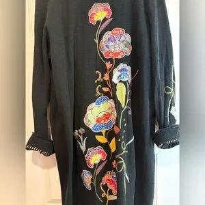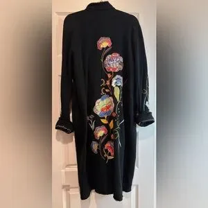 Elegant long black cardigan with vibrant floral embroidery. Features colorful patterns and intricate designs. Perfect for layering.
