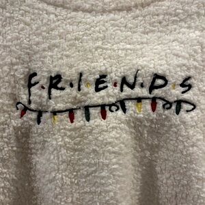 Stay cozy and stylish with this super-soft sherpa pullover featuring the iconic FRIENDS logo embroidered across the front with festive holiday lights. Perfect for lounging, casual outings, or gifting to the ultimate Friends fan!