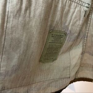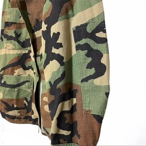 Unisex hot weather unisex shirt/jacket/coat camouflage pattern with what I believe is the US Marines emblem on pocket. Two little distress holes near and on right side chest pocket. Covered button closure on pockets and down front. There is measurements given on the neck tag but I will give length to better describe length . Other measurements I’ll give upon request. Length is aprox 31” sleeves can be adjusted with buttons and can be cuffed. Perfect for all seasons!