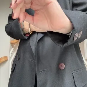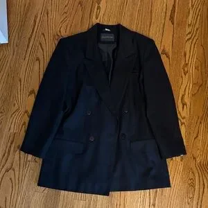 Classic meets modern in this perfectly slouchy, tailored blazer. Features a relaxed oversized fit, structured shoulders, and a double-breasted front with sleek buttons. 100% wool. Fully lined for comfort, with front flap pockets and long sleeves that can be cuffed for a casual look.