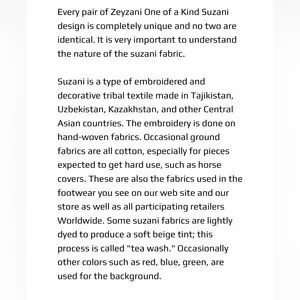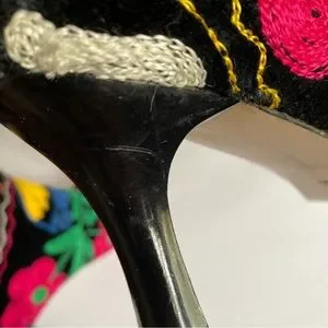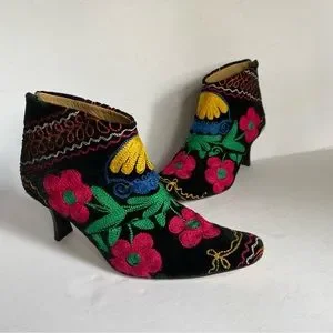 Zeyzani Suzani hand embroidered ankle boots. Back zip. Snip pointed toe design. Full leather lining. Glossy kitten heel- approx 2.5”