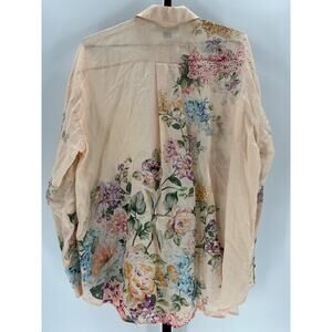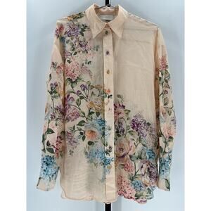Zimmermann 'Halliday' Cream Ramie Relaxed Shirt Size 2: all-over floral print, bead-embellished buttons, semi-sheer construction, pleat detailing at the sleeves, box-pleat detail to the rear, straight-point collar, drop shoulder, long sleeves with buttoned cuffs, front button fastening, curved hem, unlined, measurements: 24 inch bust x 28.5 inch length.