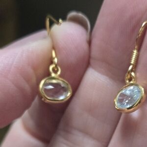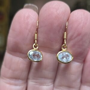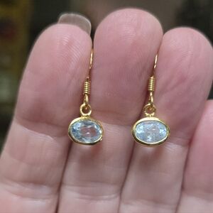 These exquisite earrings feature a beautiful blend of gold and crisp baby blue natural 2karat each topaz. They are perfect for adding elegance to any outfit. The oval design offers a timeless appeal. These are NEW earrings fresh from my jewelers studio for my Natural Edge Kharma Collection 2025. They are made with solid 925 sterling silver dipped in 24k gold.
