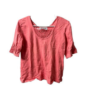 Joseph A Womens Coral Orange Blouse Medium Pullover Short Sleeve Crochet Sequin