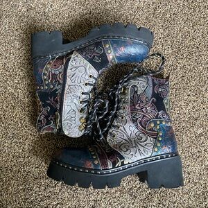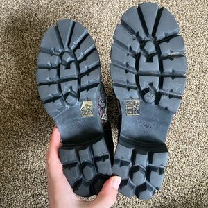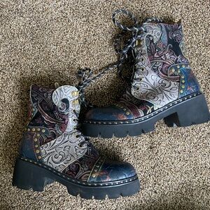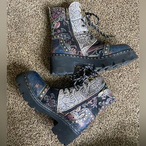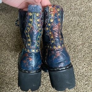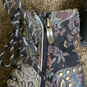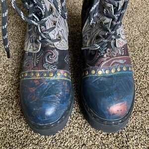 Good preowned condition, lightly worn. Only flaw is the zipper on the right boot is stuck in place, does not affect wear as you can lace up the boot instead. Get these at a fraction of the retail cost!